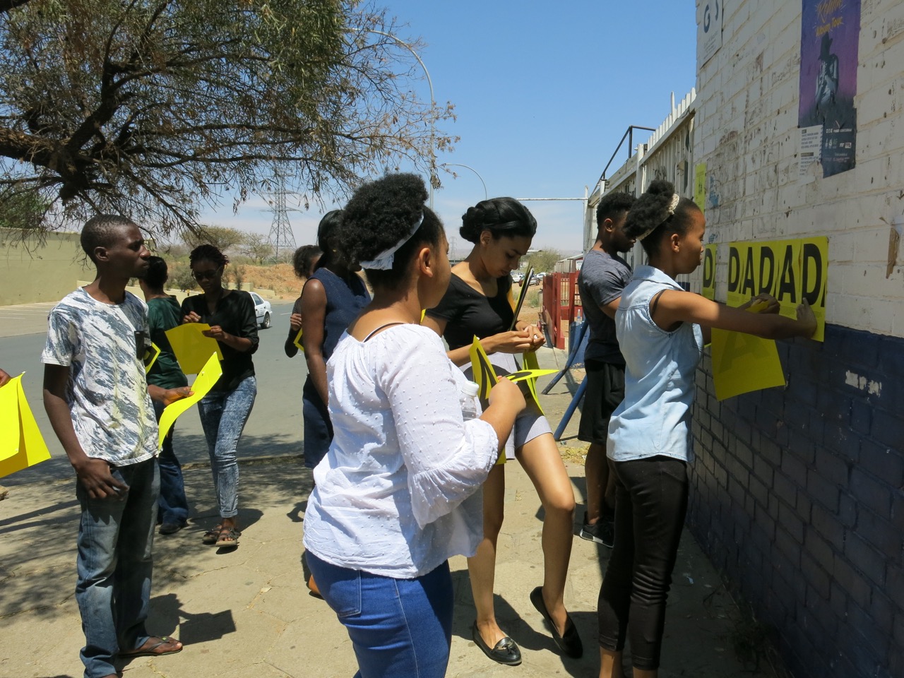 I received two replies and I made one proposal. I wanted to read the content of the posters to the University of Namibia art students and place posters with them in the city. And that is what we did on the 5th of September. Today the 30th of September I visited the College of the Arts graphic design students and I read the posters and read the manifesto by Hugo Ball written on the 14th July 1916, and we made a installation on a wall that serves as a public space for posters.