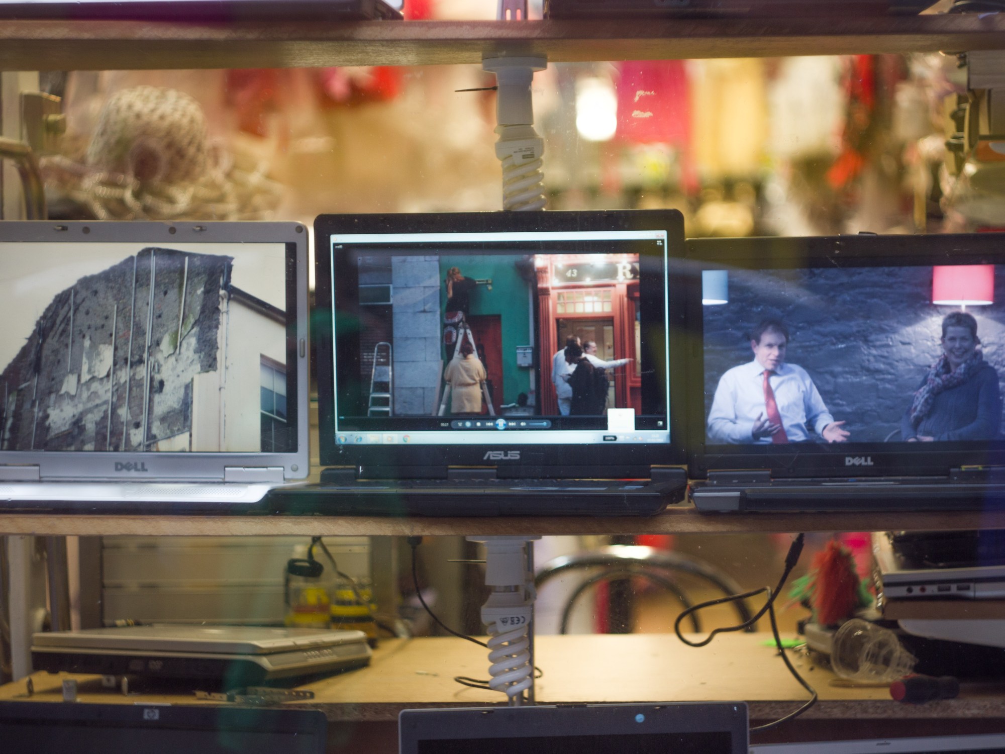 Nine stories were chosen to be recreated in the final intervention. Five of the stories were childhood memories from an email I had received prior to my arrival in Cork by a pharmacist who grew up above the pharmacy she later inherited from her mother. Others had been discovered during the first three days of the project. Most of the memories were interpreted through spatial installations integrated into meaningful locations in the Street. One of the stories was told through a performance. The individual installations represented the memories of the participants, thus resembling a tour of memories that could be attended in the Street during the final day of the festival. The tenth element of the intervention was a triple video projection in one of the shop windows. The first screen showed photos in a loop taken in the Street during the research phase. The second showed the making process, while the third screened rough cut of the documentary based on the conversation between the two traders. Some of the stories remained in the Street long after the actual tour, without being rejected by the space, community or authorities.