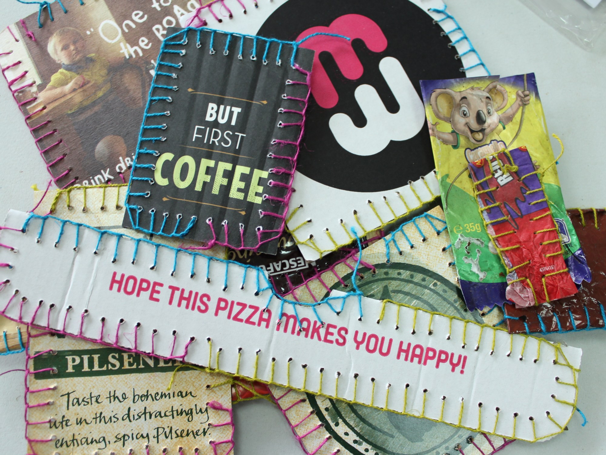 I continued my new project at the Tjutjuna Aboriginal Arts and Culture Centre in Ceduna. I was collecting rubbish around there and stitched the found pieces for a day. We also spent a few days working with Fibrespace artists and makers at Platform Gallery in Port Augusta. There, women started to bring me some of their own rubbish, such as chocolate and candy wrappers, for my work.
