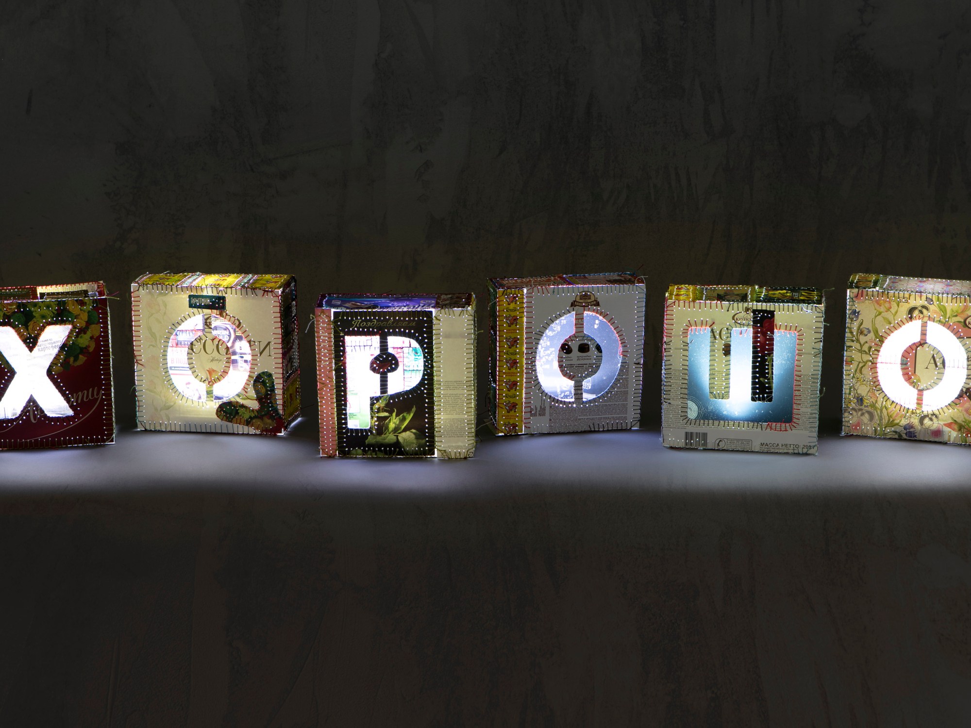 From the items I collected in Murmansk, I created an art piece called Хорошо (Haraso-Hyvä-Good). It is based on familiar Russian words, such as haraso, holodna, and others I heard there. My late mother used those words when I was a child. The shape of the art piece is based on the colourful and appealing neon lights in Murmansk. All three art pieces are now in the Naisia maailman laidalla exhibition in Helinä Rautavaara Museum in Espoo, Finland.