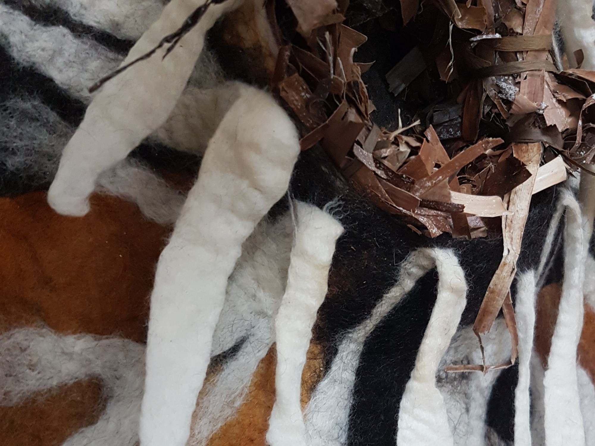 The nest occupied my mind, as the beauty I see in Australia, my new home, is being trashed (similar to Namibia, my ‘home for always, but never again’). The nest that the boy gave me inspired the purpose of felting ‘Nest’ with natural fibres and environmentally friendly soap. The idea is to take them back to the environment, where birds can use them as materials to build their nests. This idea stems from observing two birds in my patio studio at home who unravelled some of my experimental weaves to harvest materials for their nests. While making some awesome acrobatic moves to access the weaves through the trellises, they frayed the weaves, pulling fibres from them for their own nests.