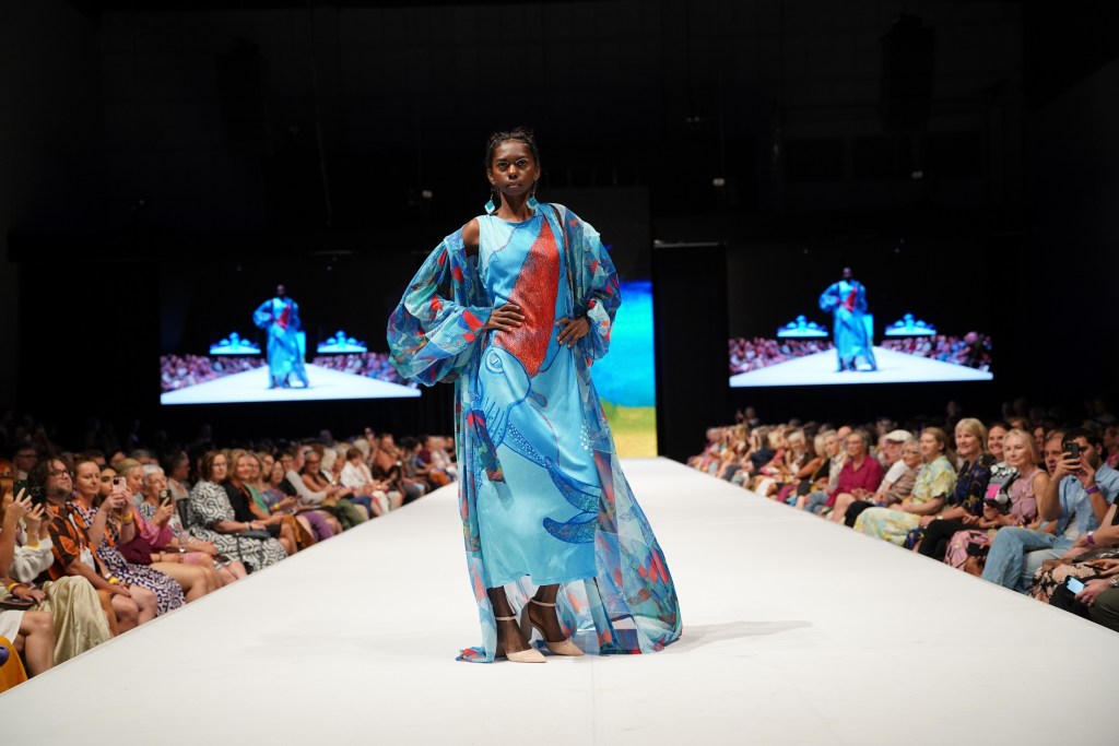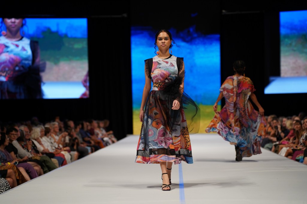 See the collection at 16:39 into the video below: Collection by Sonya Coleman (Indigenous Artist), Amna Qureshi (Digtial Textile Design) and Melanie Sarantou (Fashion Design).